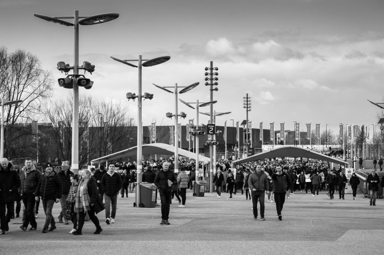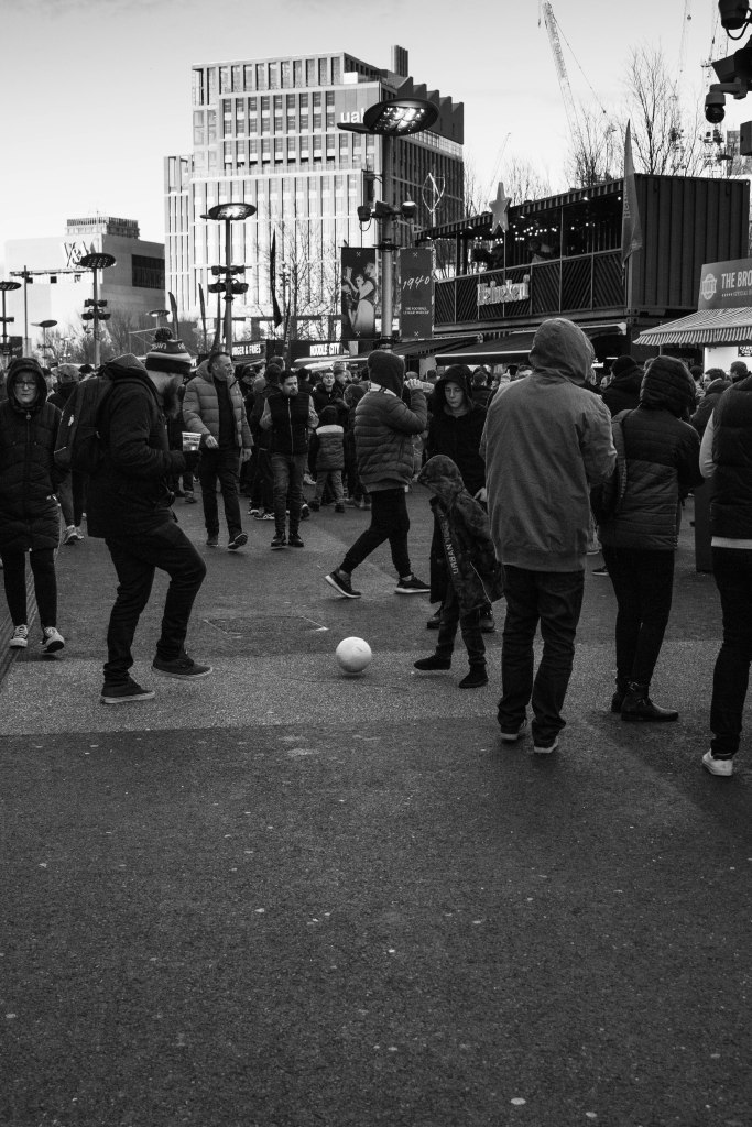 When we have the earlier kick offs there’s a chance to walk around the outside of the stadium to capture some natural shots of fans. Young fans chatting and plenty of people taking photos against the posters and logos around the ground.