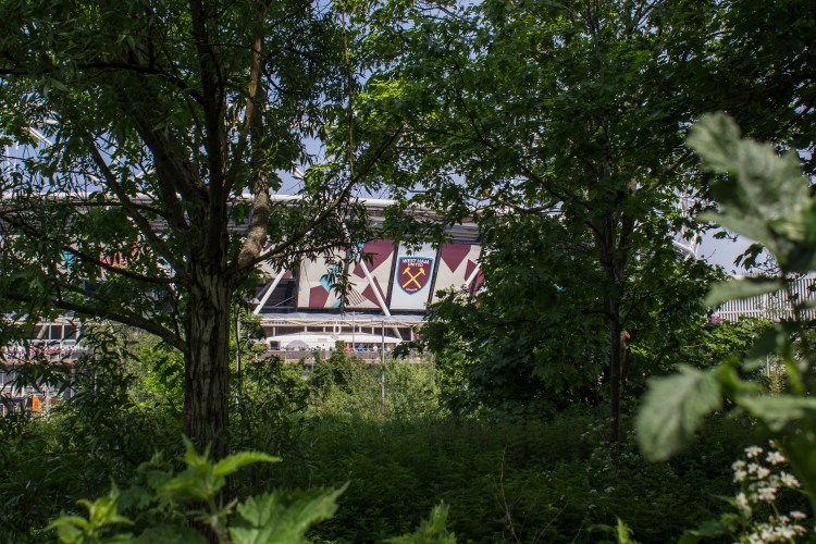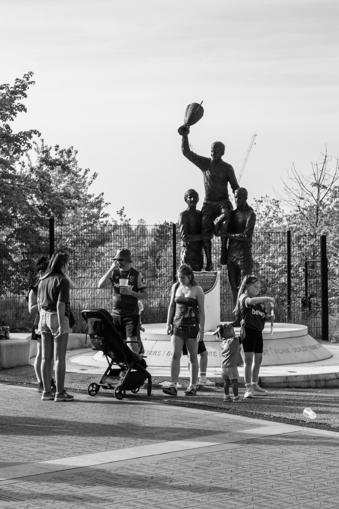 The Champions Sculpture depicting World Cup heroes Bobby Moore, Geoff Hurst, Martin Peters and Ray Wilson stands outside the London Stadium, moved from its original site opposite the Boleyn Ground in Barking Road is always a great backdrop for a few photos. A family here enjoying the early summer sun after the match.