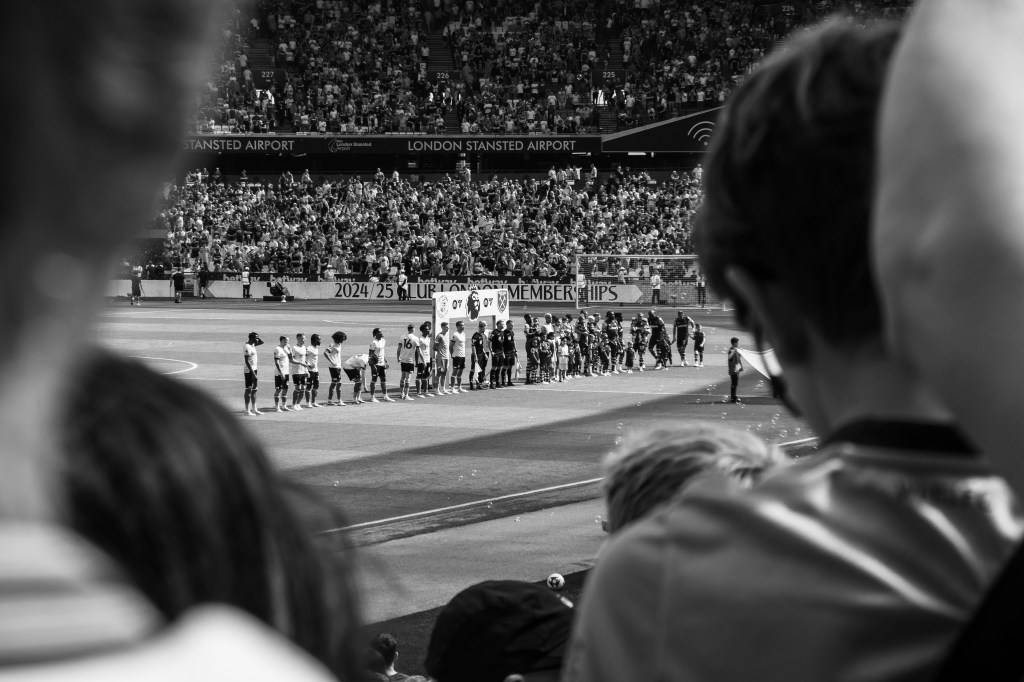 The music plays out around the stands as the players of both teams walk out onto the pitch and line up in front of the main stand. The crowd sing and chant with arms held high as bubbles appear and float high above our heads building to a crescendo as the match starts.