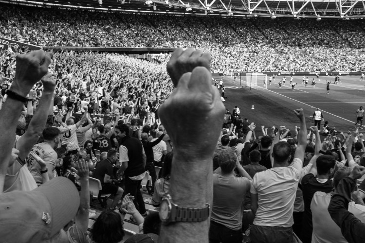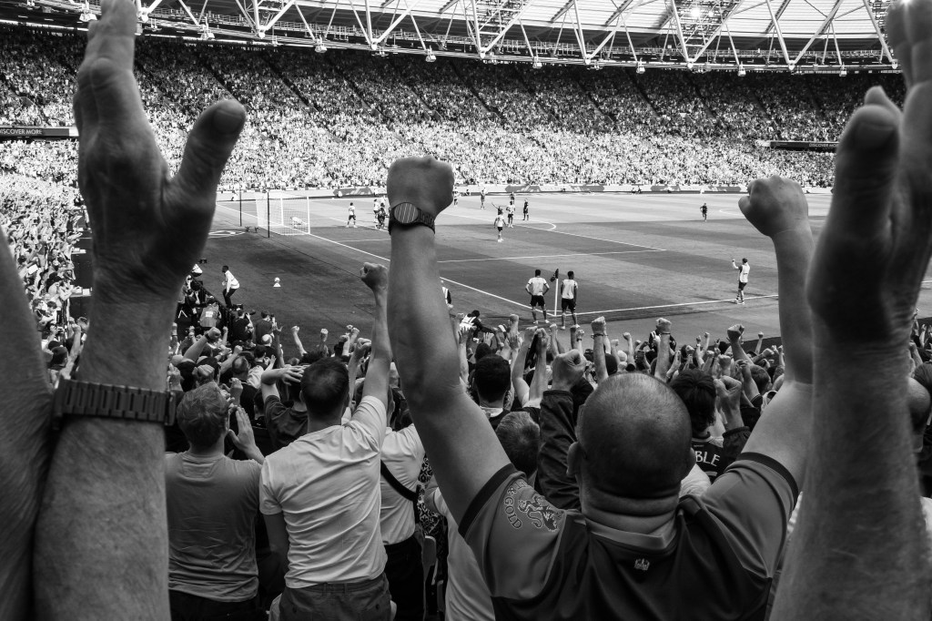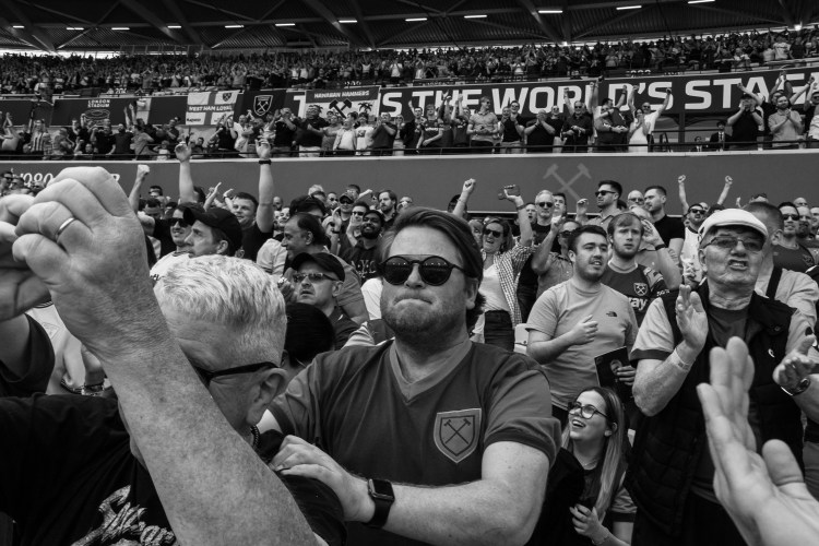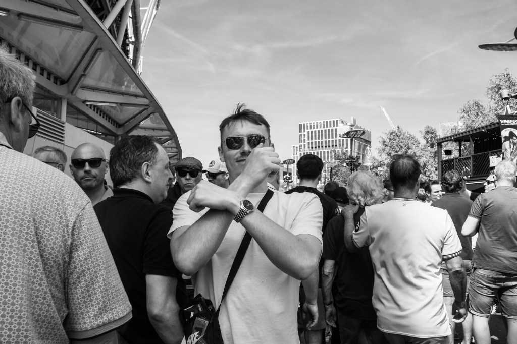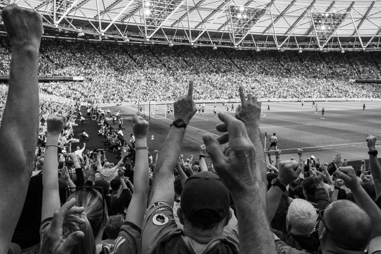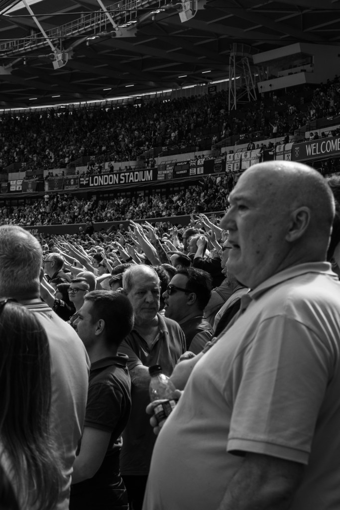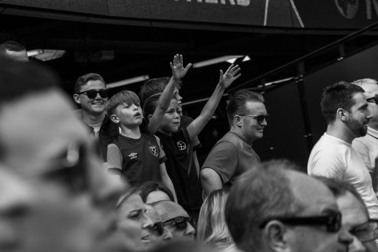 Then I swing back around towards the pitch to try and capture the team as they celebrate Soucek’s goal and then his image appearing on the large screen. As the team gather I think of how the image could be more interesting, so I’m moving around to try and capture some depth of field with fans taking photos and celebrating.