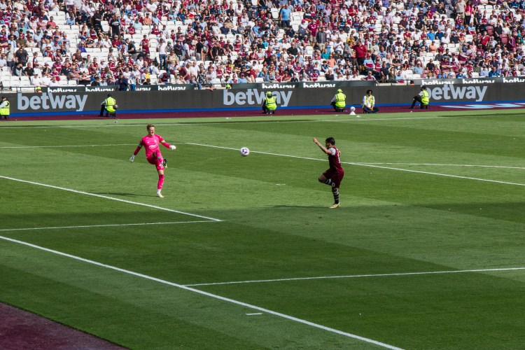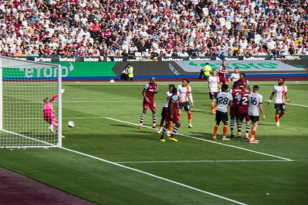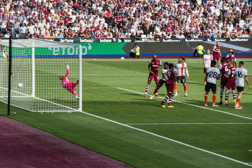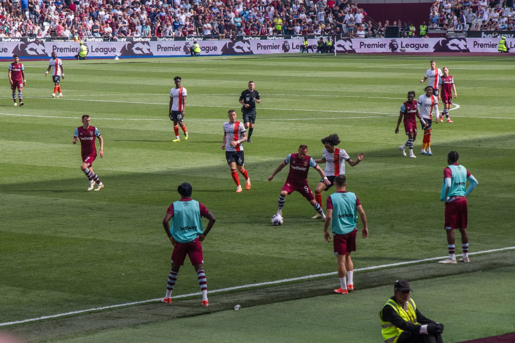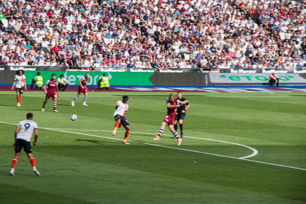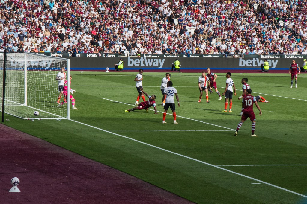 Lucas Paqueta, so disappointing throughout the season, challenges Luton Town’s Belgian goalkeeper Thomas Kaminski to the ball. The issues that surround Lucas has surely had an impact on his performances on the pitch. He was probably the most disappointing player of the season because he clearly has the potential to be one of our most important players but has often gone missing in key games.