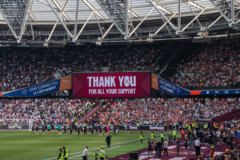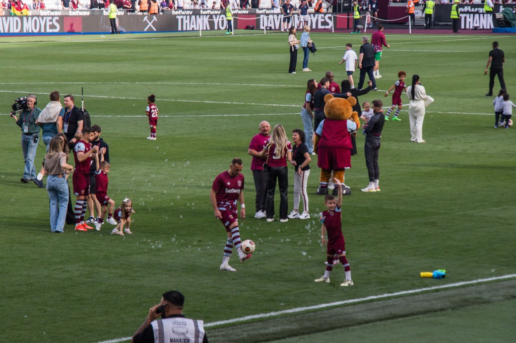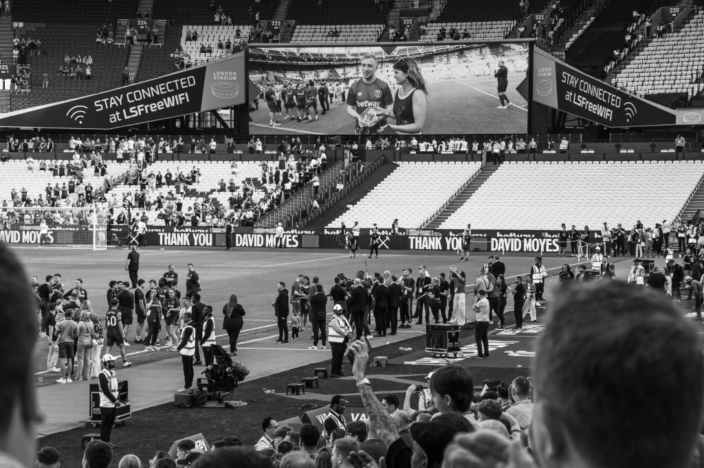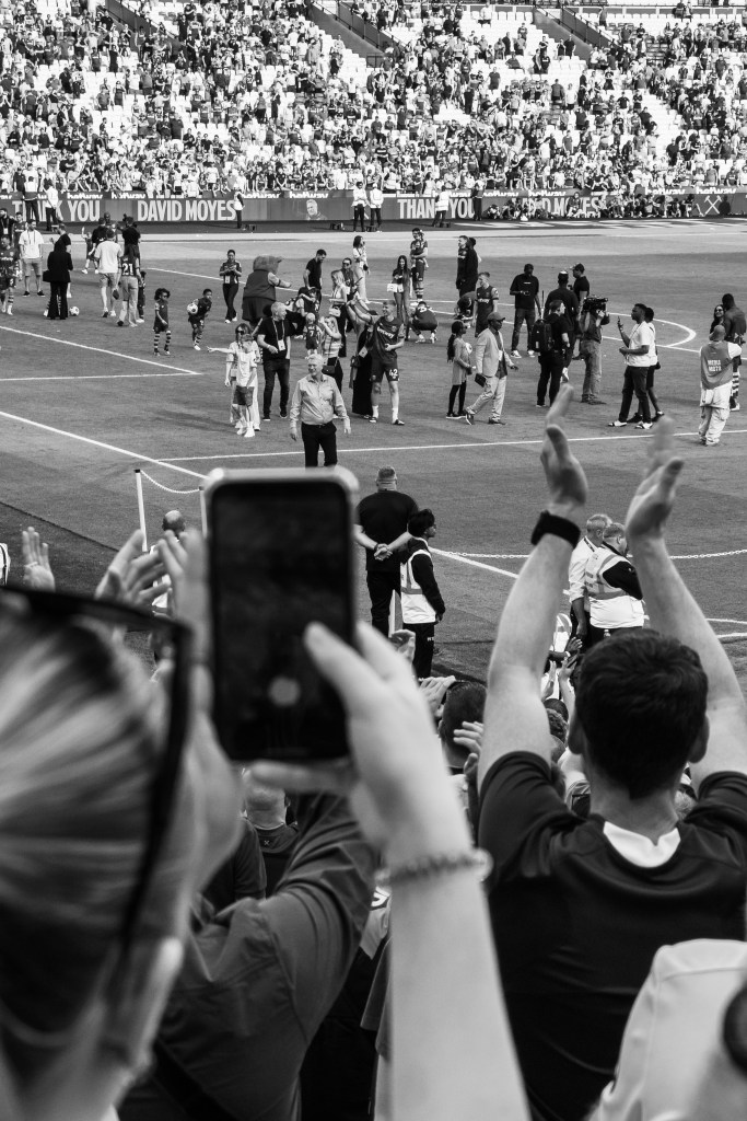 It’s David Moyes final home game as manager and the crowd respond to the Thank You David Moyes on the big screen that comes up as the players and back room staff and families start to walk onto the pitch. Opinions were divided about Moyes, but he got a lot of deserved respect in this final appearance at the London Stadium.