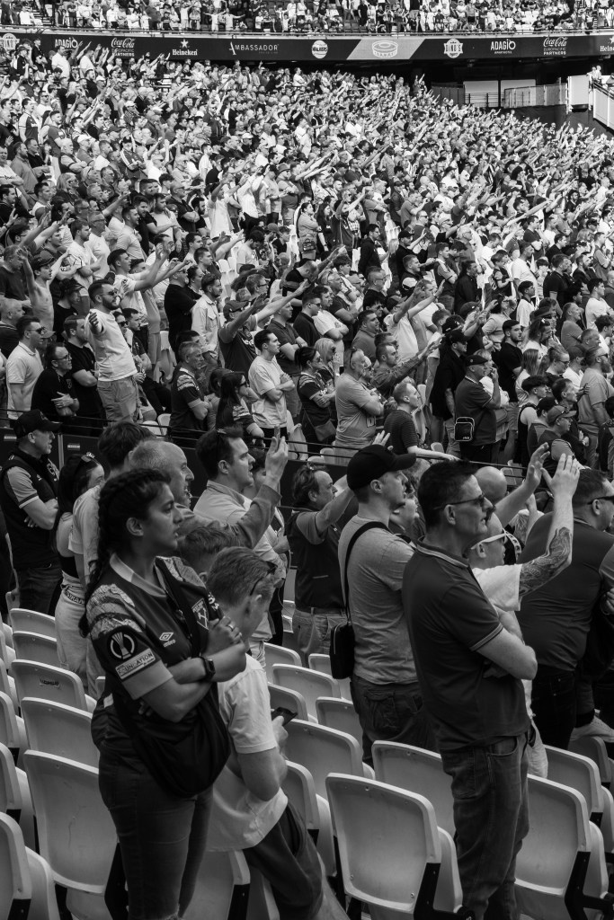 The crowd react again as I capture some shots of arms up in the air in celebration whilst focusing on the players on the pitch and then swing around pressing the shutter towards the fans behind me in the stands. It is really hit and miss and I have to rely on the camera to help me out here.