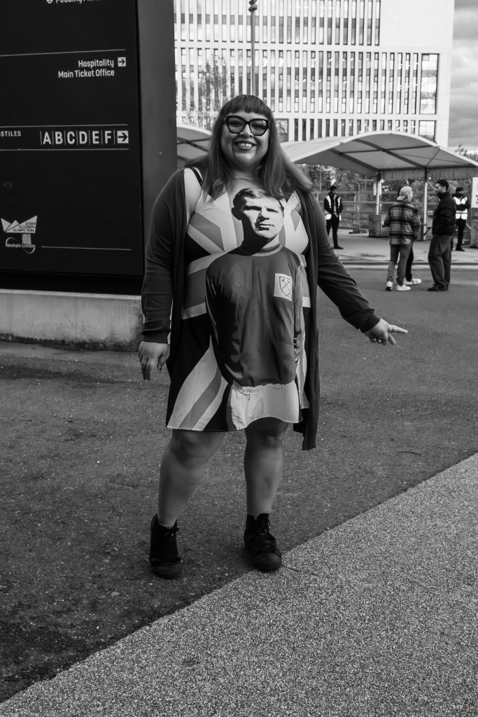 There was so much to talk about as we walked around the ground and I looked out for more interesting shoots. Found this wonderful lady dressed in a Union Jack patterned dress with Bobby Moore’s face spread across the red, white and blue design. Just had to get a shot.