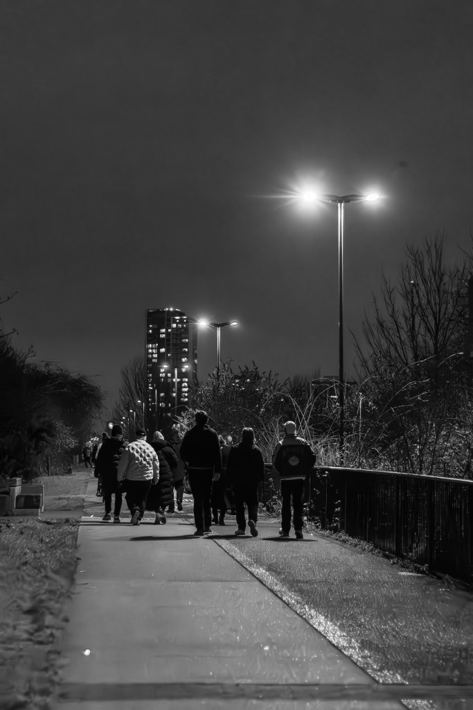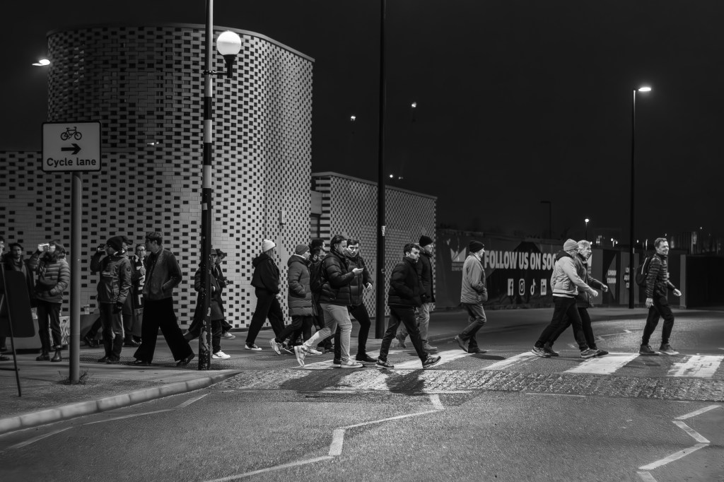 I was on my own walking to the stadium for this match, as it’s a school night the boys were unable to attend, but I was meeting with my brother as he has his seat next to mine. I was in a bit of a rush to get there and I really didn’t have the time to walk around the stadium pre match as I usually do. On my way along the Greenway I have been trying to capture fans walking to the stadium, silhouetted against the street lamps.