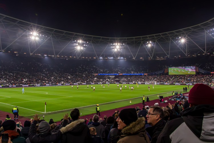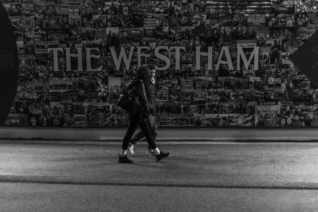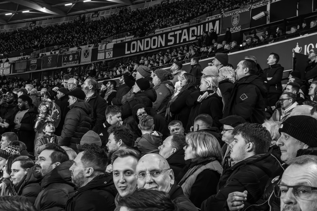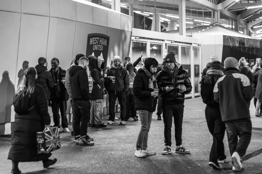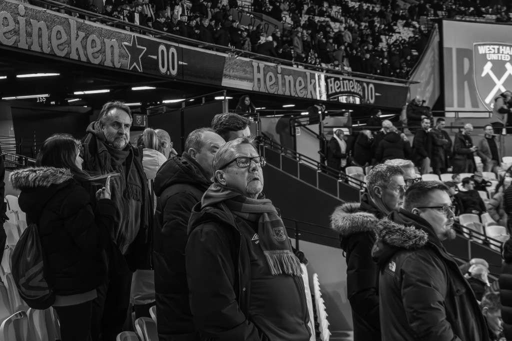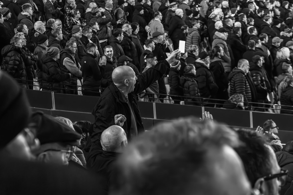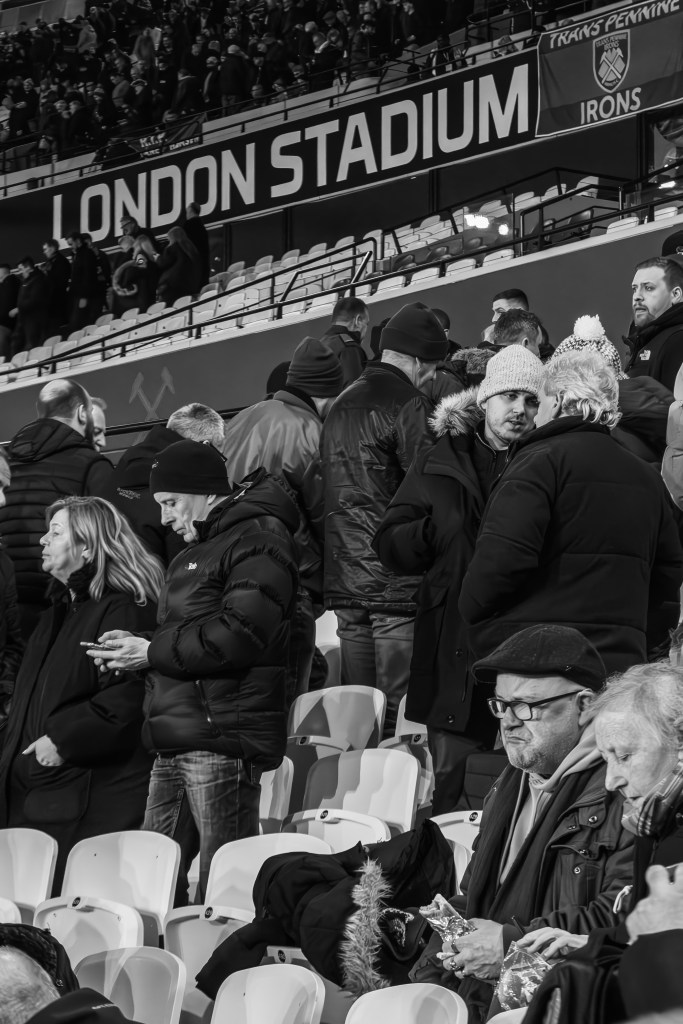 I quickly captured fans crossing the road towards the security check as I made my way directly to turnstile A to join the queue. The new camera is a little bigger but with my nifty 50mm lens on the body it doesn’t seem to be an issue with the security checking my deliberately battered and worn camera bag. I engage in a bit of distracting banter as I open the bag slightly and I’m quickly through and skip amongst the crowd around food and drink area just inside the stadium and then climb the stairs and into the stands.