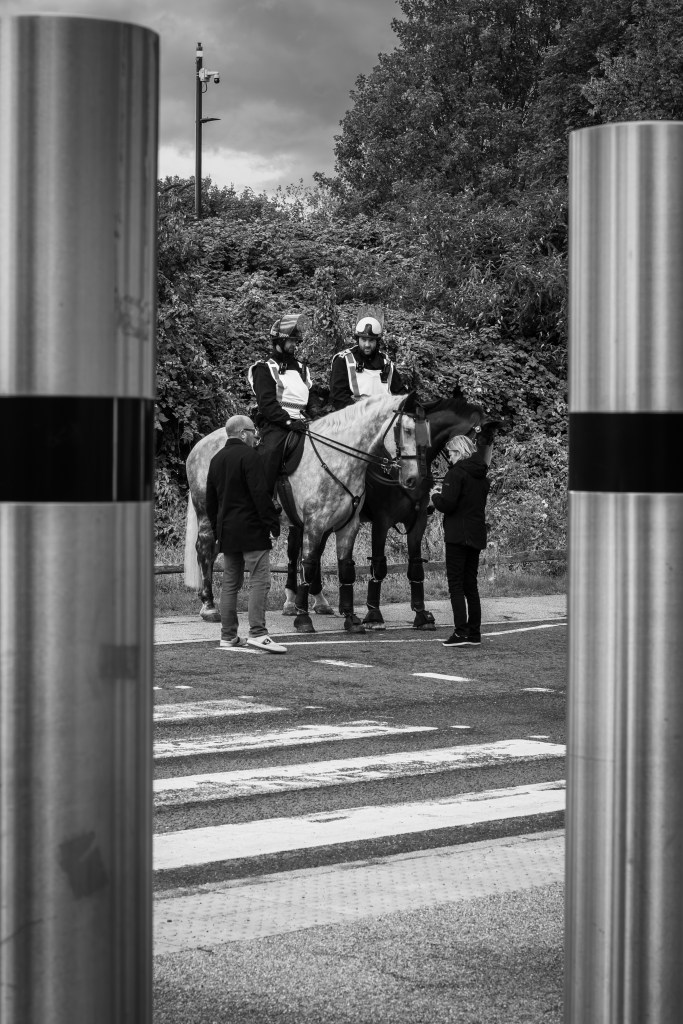 Walking around along the road towards the community football pitch and running track, I was looking between the bollards that greet visitors and captured these fans chatting to the police on their horses.