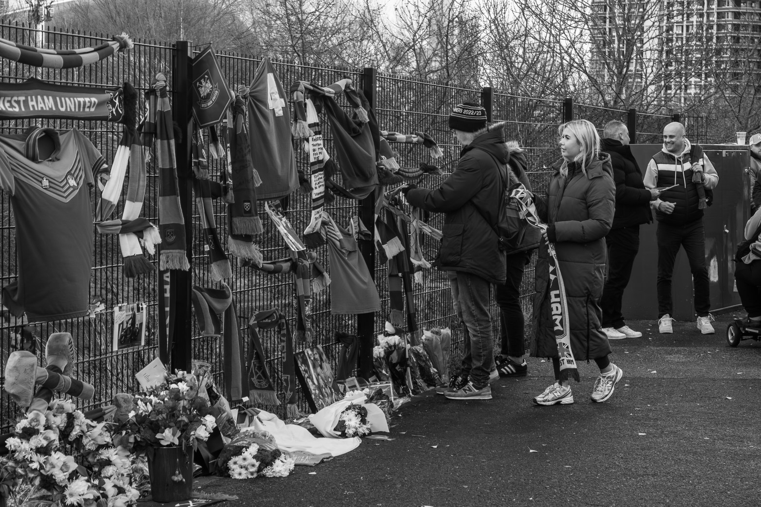 There was a sense of real loss as fans stood respectfully along the gathering wall of scarfs, flowers, T-shirts and cards and I observed many tying their memories to the railings, stopping to say a few words, have their photo taken pause again just before making way for others to show their respects.