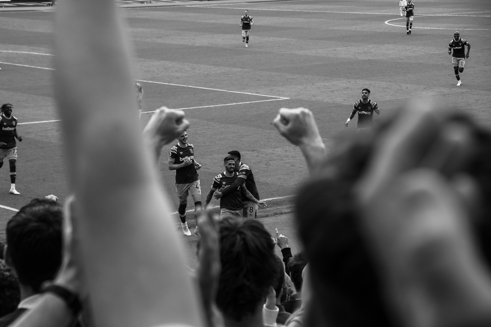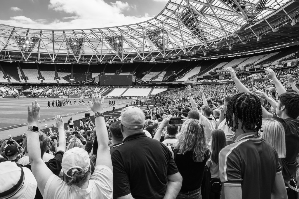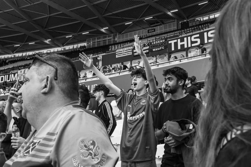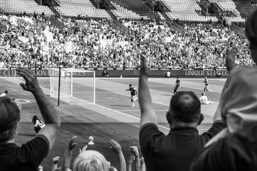 Then I swing back around towards the pitch to try and capture the team as they celebrate Soucek’s goal and then his image appearing on the large screen. As the team gather I think of how the image could be more interesting, so I’m moving around to try and capture some depth of field with fans taking photos and celebrating.