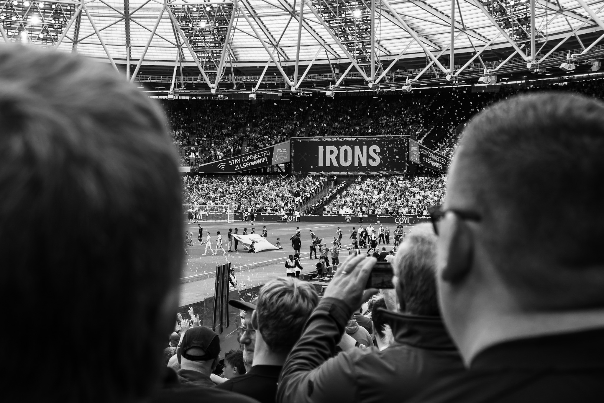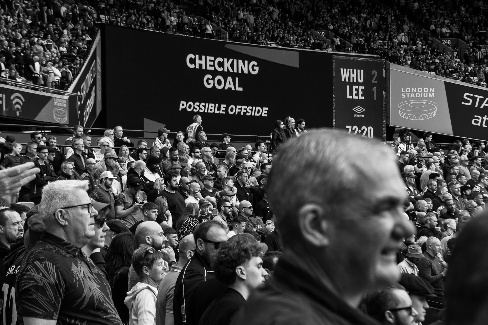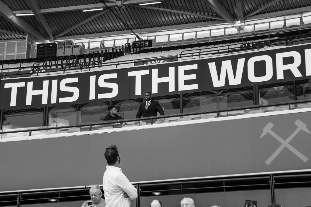 Then I swing back around towards the pitch to try and capture the team as they celebrate Soucek’s goal and then his image appearing on the large screen. As the team gather I think of how the image could be more interesting, so I’m moving around to try and capture some depth of field with fans taking photos and celebrating.