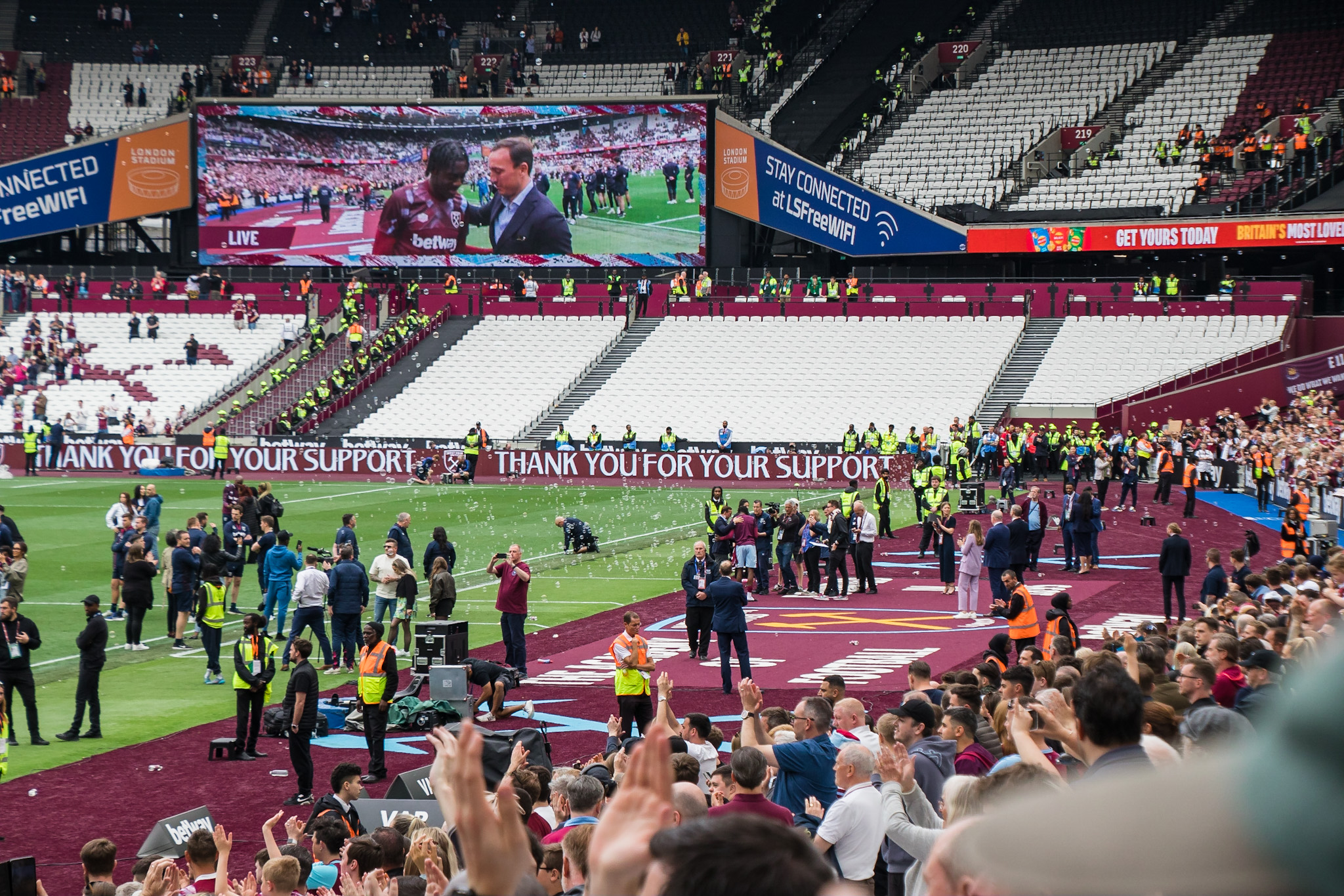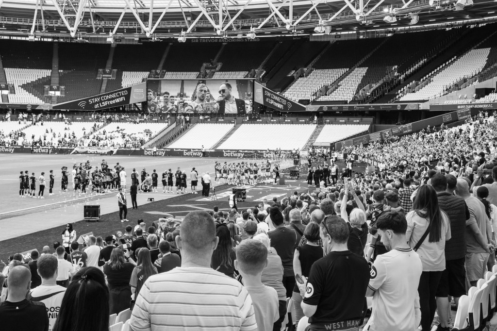 It’s David Moyes final home game as manager and the crowd respond to the Thank You David Moyes on the big screen that comes up as the players and back room staff and families start to walk onto the pitch. Opinions were divided about Moyes, but he got a lot of deserved respect in this final appearance at the London Stadium.