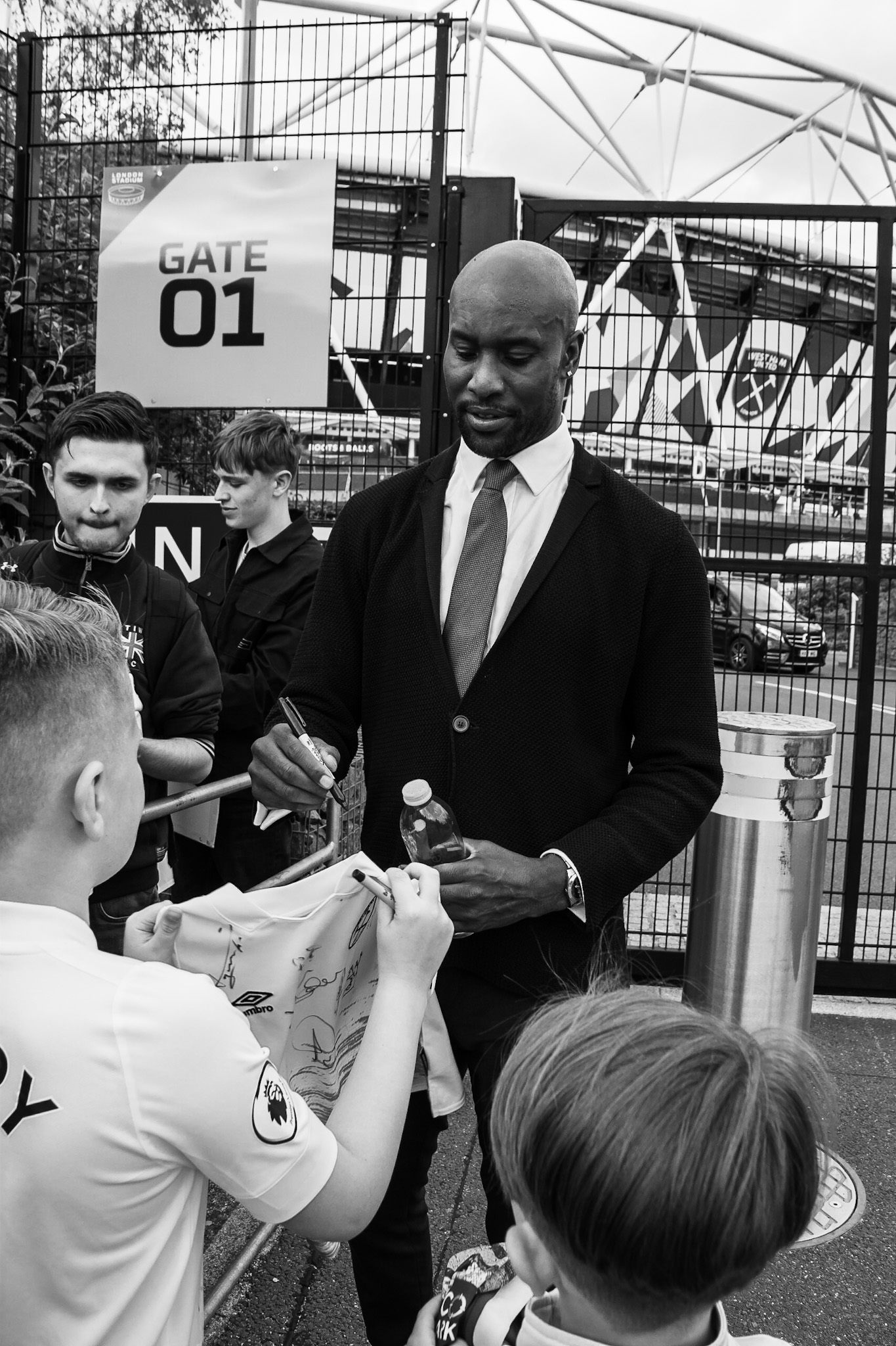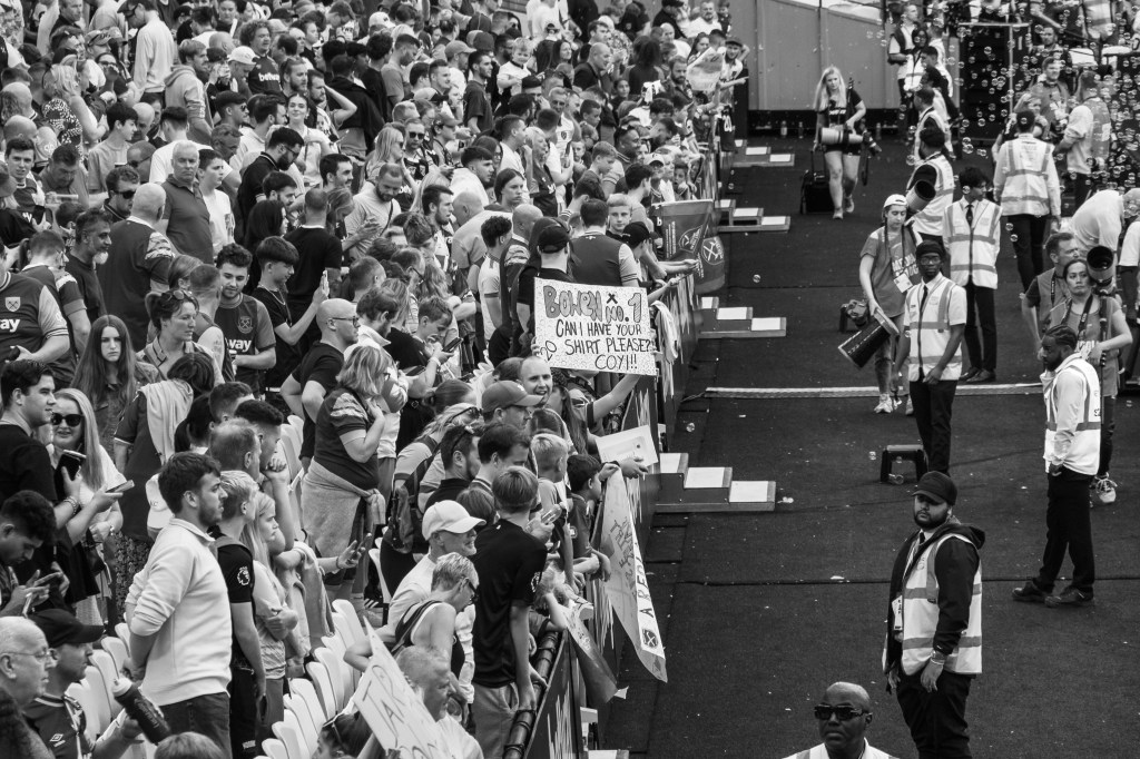 Players rarely stop these days after matches, many driven home or on to somewhere else, or they just drive away without stopping. Declan Rice always stopped though. I stand and wait for a while to see if anyone does stop and a rare appearance by Antonio catches me as he signs a programme for a young fan. It’s a bit hit and miss capturing decent shots as there are lots of fans trying to get access to the players. But I managed to edit this one enough to make it a good shot.