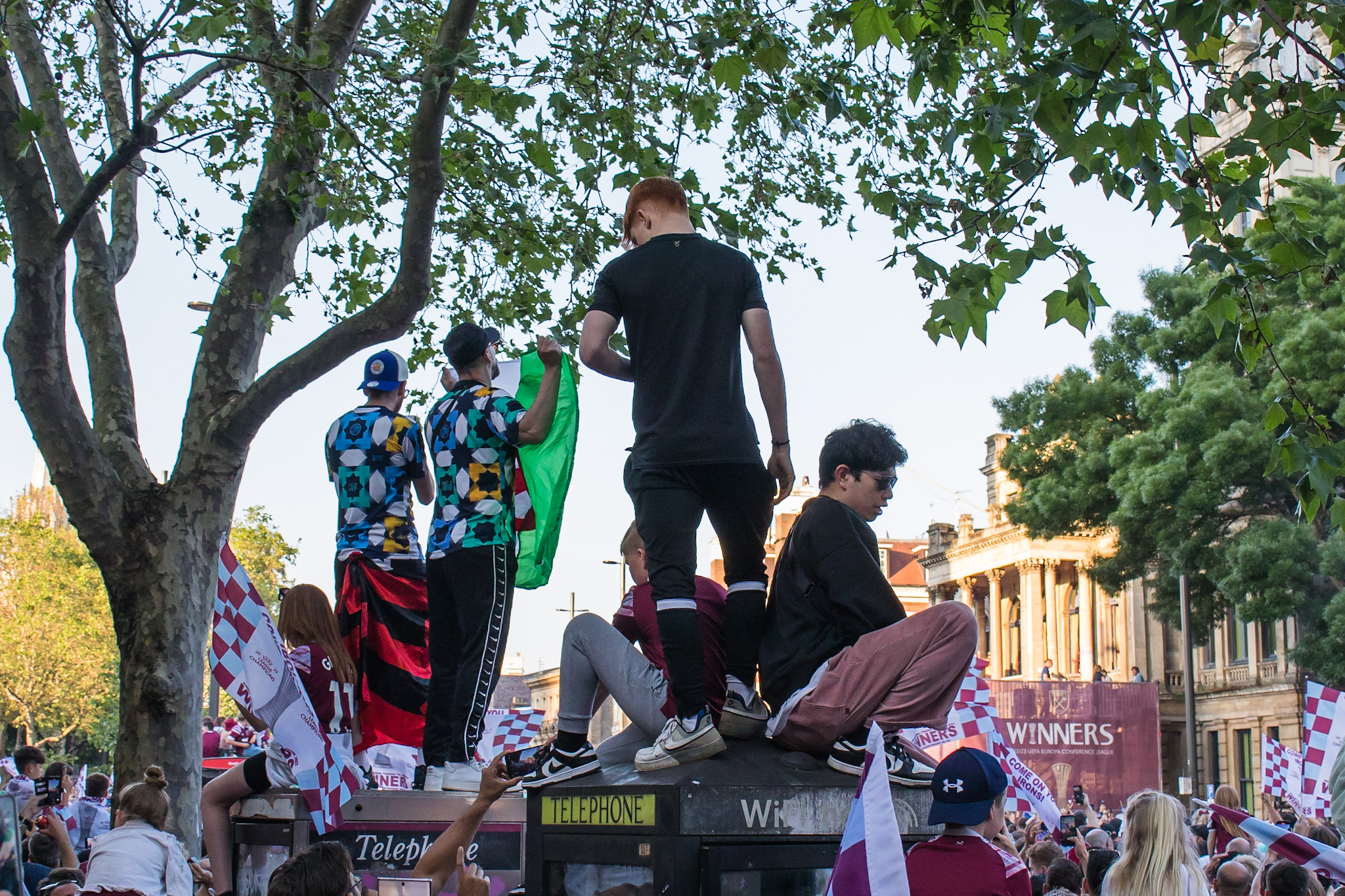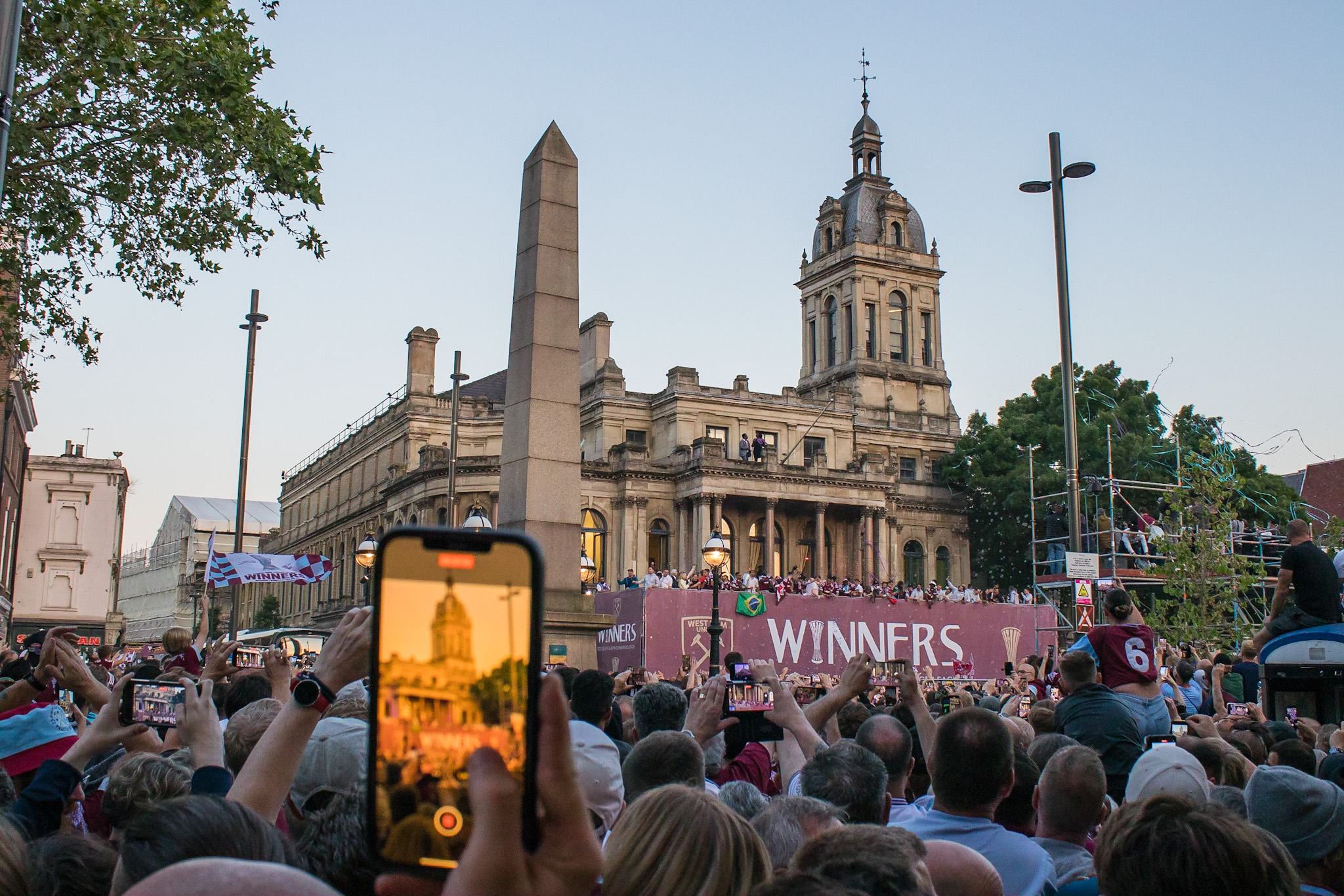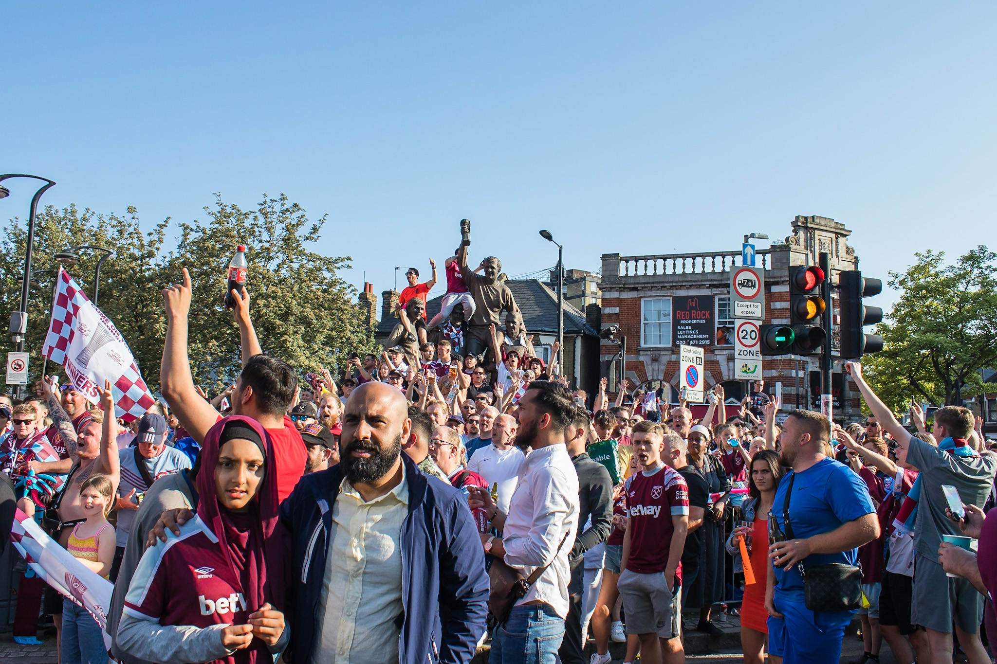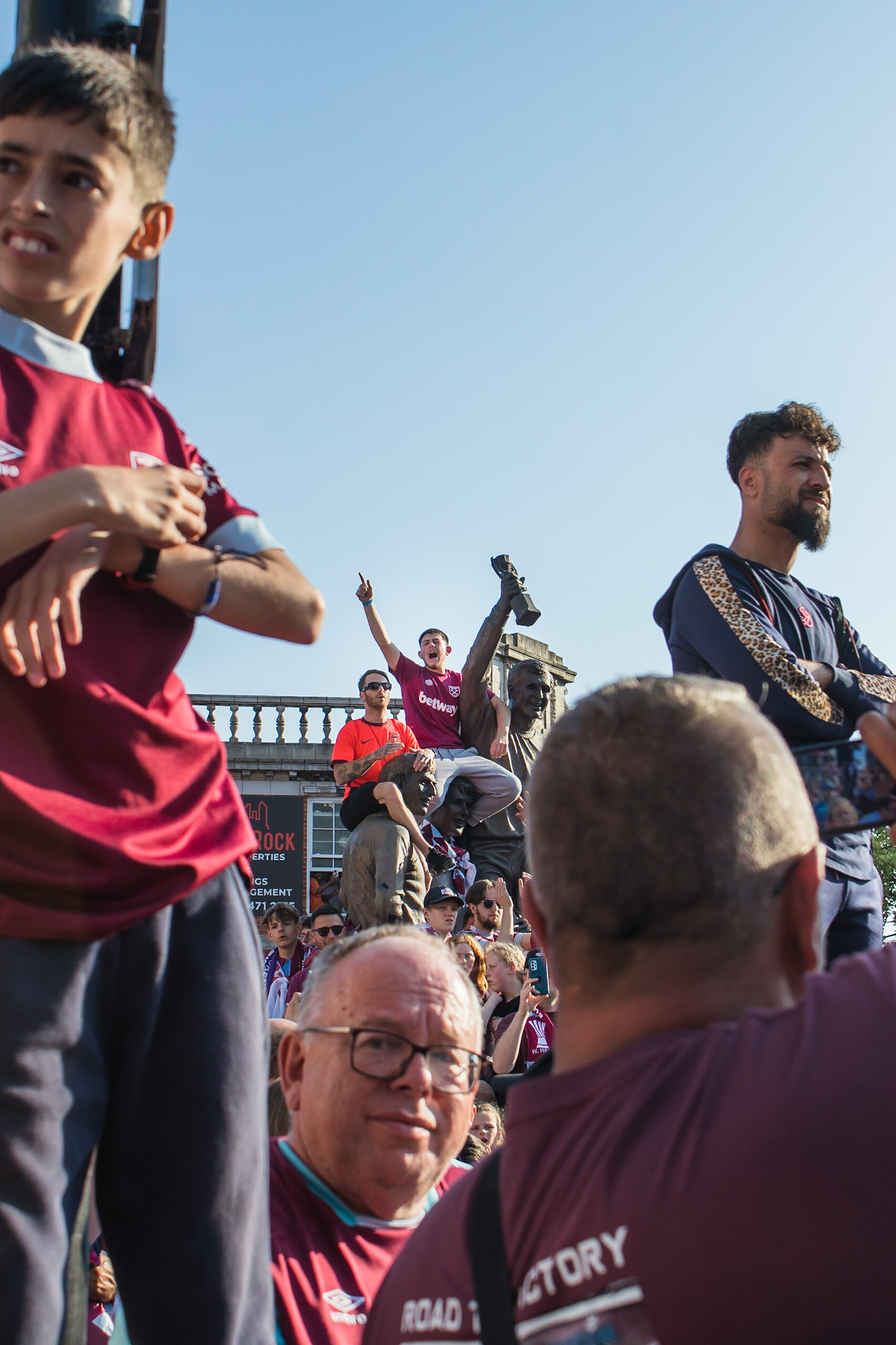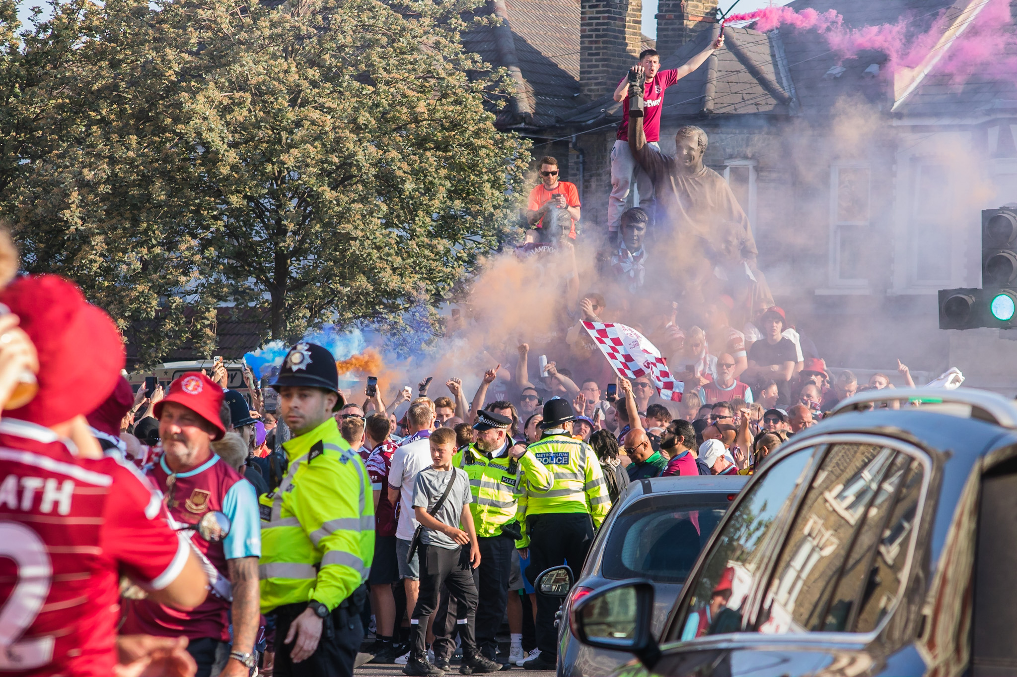 As the police struggled to control the passions of young and old fans alike, the tour bus turned passed The Champions sculpture at the junction of Green Street and Barking Road, covered in fans and billowing claret and blue flares from the hands of fans precariously balanced on top.