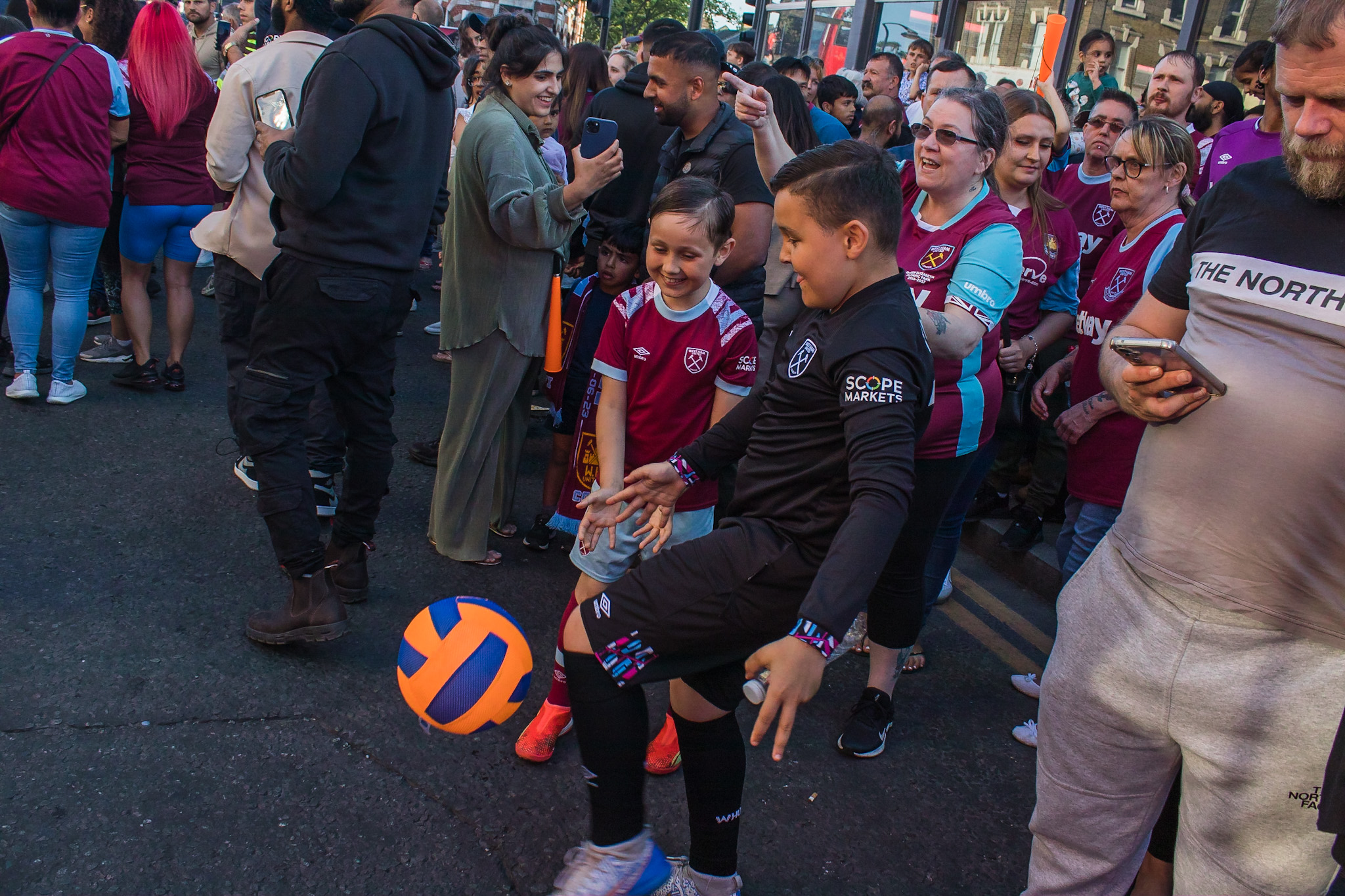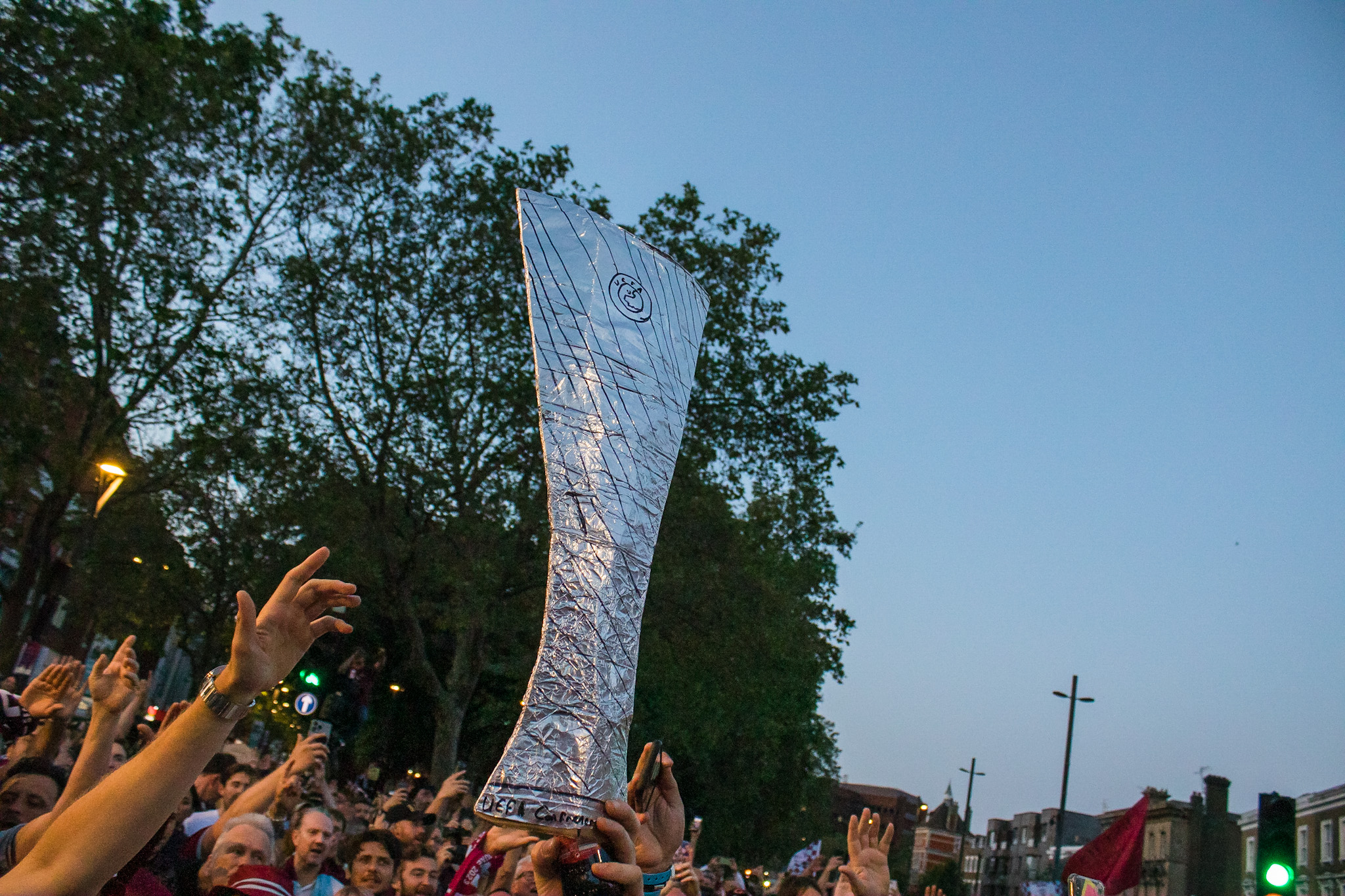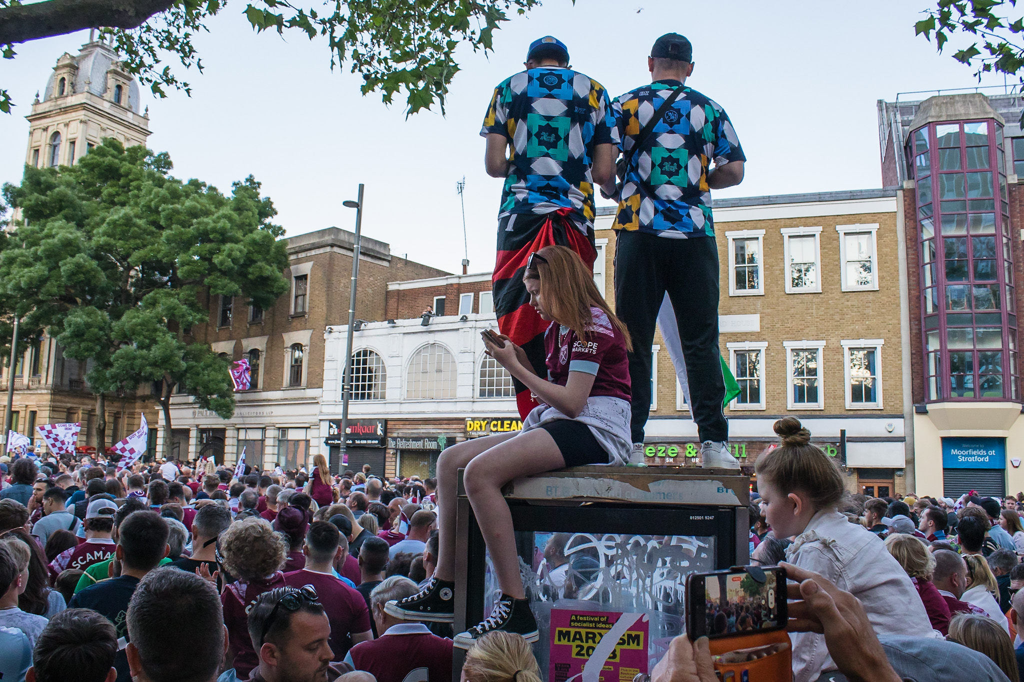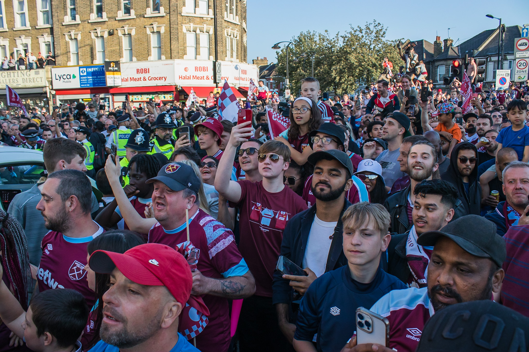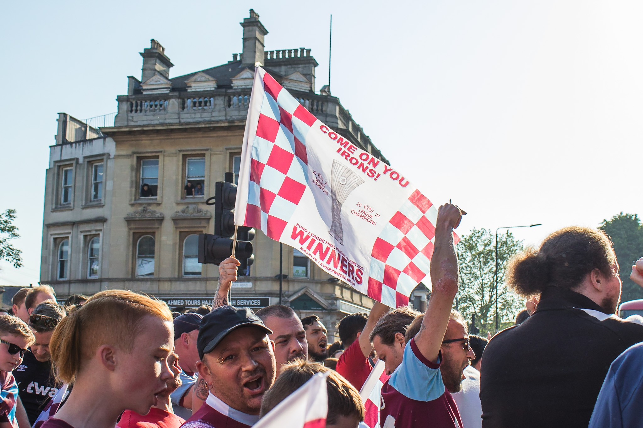 As the police struggled to control the passions of young and old fans alike, the tour bus turned passed The Champions sculpture at the junction of Green Street and Barking Road, covered in fans and billowing claret and blue flares from the hands of fans precariously balanced on top.