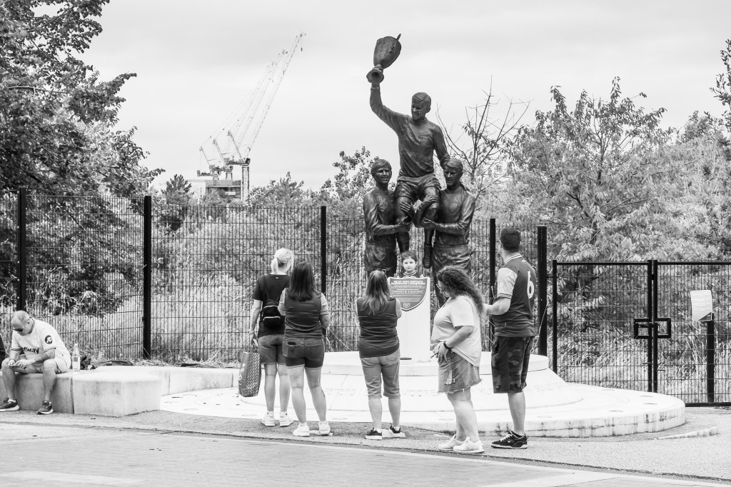 The Champions Sculpture depicting World Cup heroes Bobby Moore, Geoff Hurst, Martin Peters and Ray Wilson stands outside the London Stadium, moved from its original site opposite the Boleyn Ground in Barking Road is always a great backdrop for a few photos. A family here enjoying the early summer sun after the match.